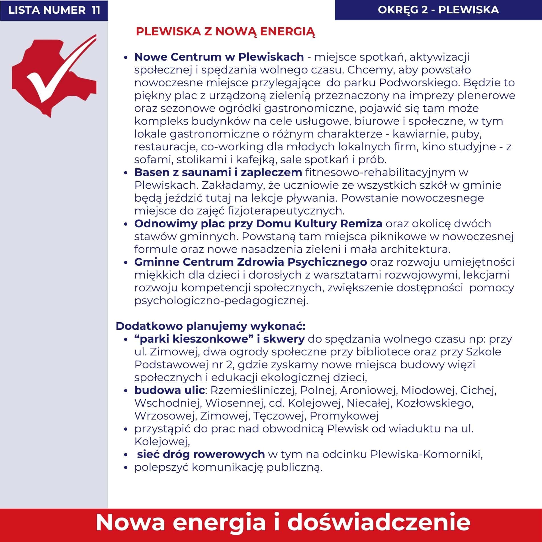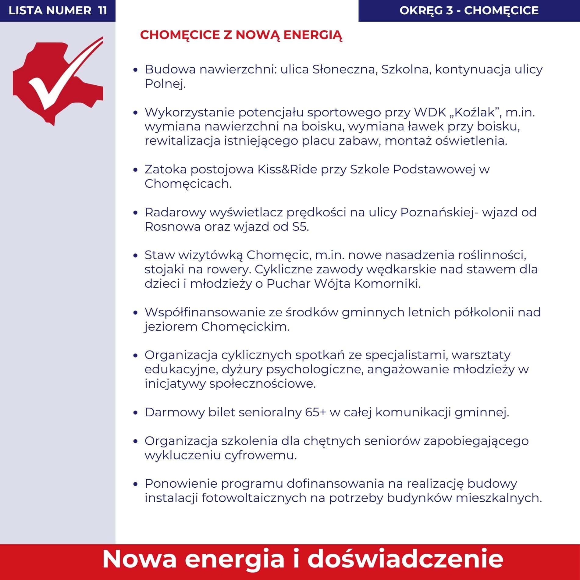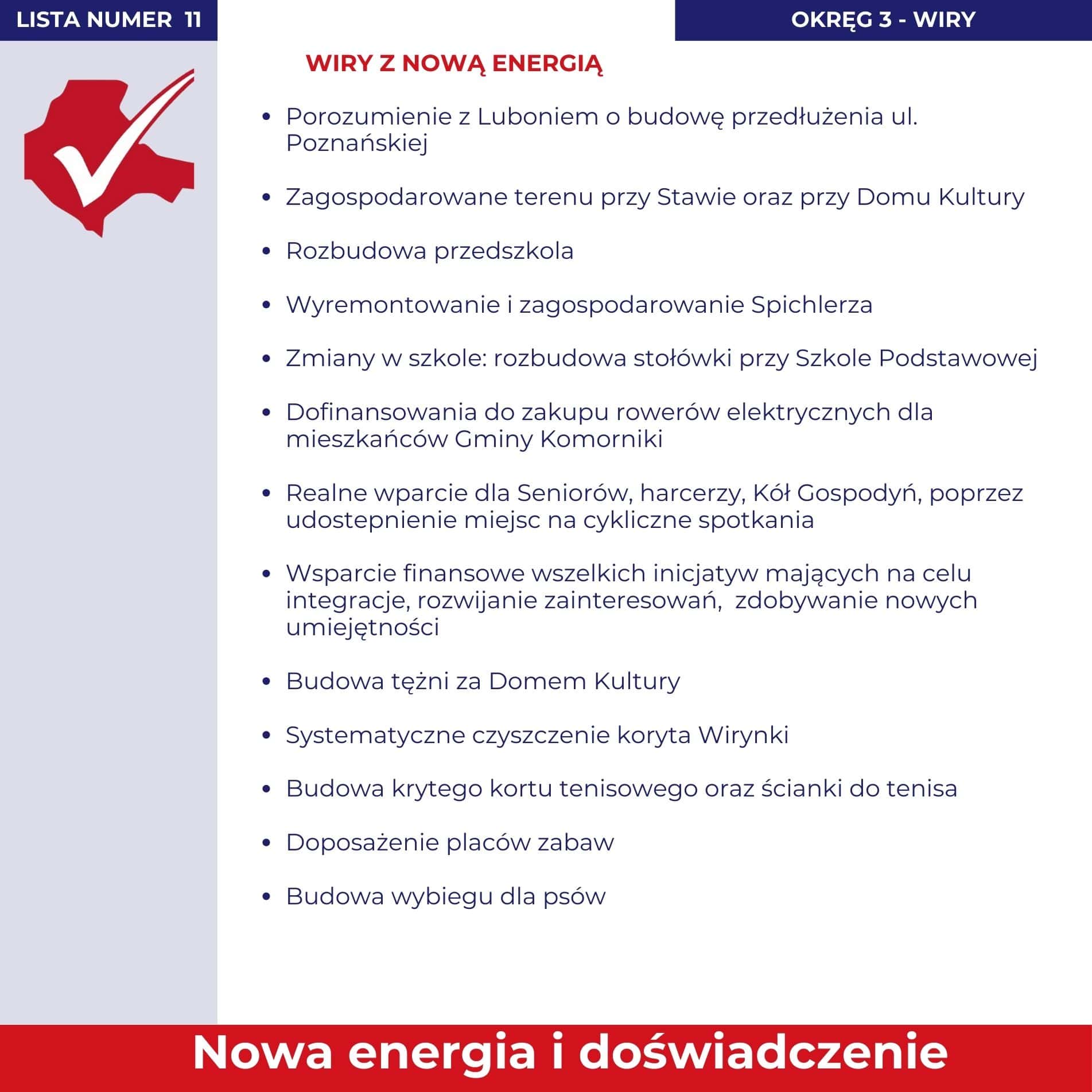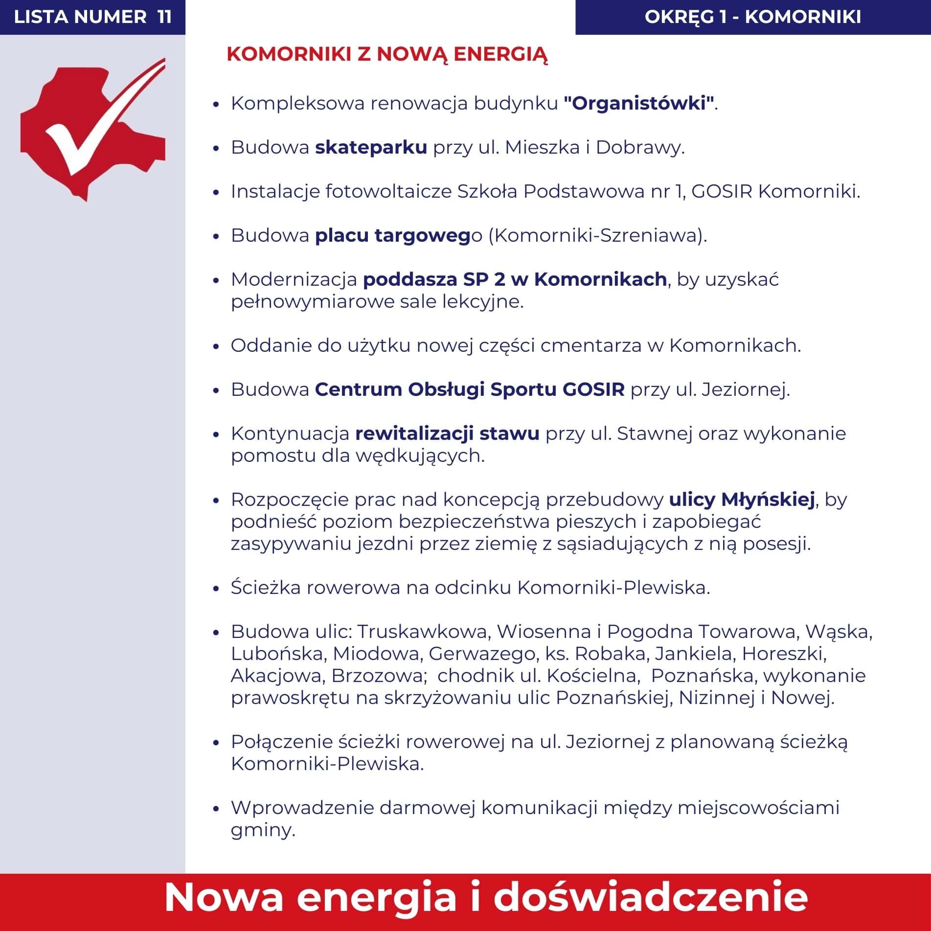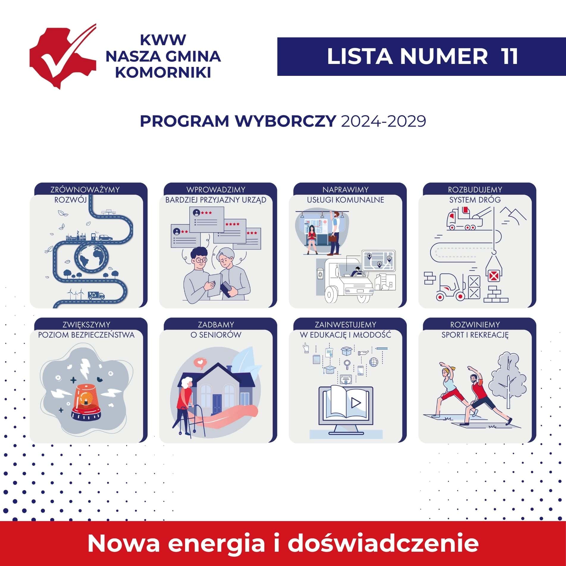 W ekipie kandydatów łączymy doświadczenie dotychczasowych radnych z nową energią, jaką wnoszą społecznicy. Razem stworzyliśmy program, na podstawie ankiety wśród mieszkańców gminy Komorniki przeprowadzonej na przełomie 2023 i 2024 roku. Wzięło w niej udział ponad 800 mieszkańców. Wnioski z badania uzupełniliśmy i rozwinęliśmy własnymi przemyśleniami oraz propozycjami zgłaszanymi w czasie rozmów z wyborcami. Opracowaliśmy dalekosiężny plan działań na najbliższą kadencję, ale i wyznaczyliśmy kierunki rozwoju na kolejne lata. Tempo, sposób i zakres realizacji naszego programu uzależnione będą oczywiście od możliwości budżetowych, współpracy z wójtem i liczby naszych radnych w Radzie Gminy.
